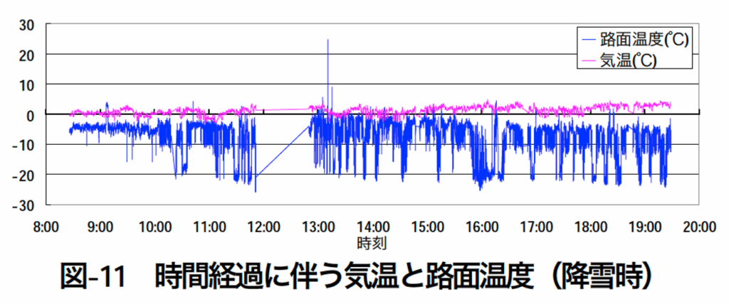 夜間気温が下がるのは分かると思うのですが、路面温度はどうでしょうか?下の図は東北地方で行われたある実験の結果です。少し読みづらいのですが、路面温度と気温の関係をグラフにとったものです。ピンクの線が気温で青い線が路面温度です。夜間に車を走らせながら測定したようですので、下に飛び出たノイズがかなり入っています。この青い線(路面温度)をじっくり見ると16時から17時辺りを境に路面温度は低下を始め、9-10時頃からまた上昇しているのが分かります。路温が低く出ている部分をノイズとすると、昼と夜とでは路面温度が5℃程度違います。つまり夜間の融雪は昼間よりも5℃余計に上げないと雪がとけないのです。つまり夜間は昼間に比べて燃料を消費してしまうということになります。夜間運転を少しでも減らすことができればロードヒーターの燃費も抑えられそうです。