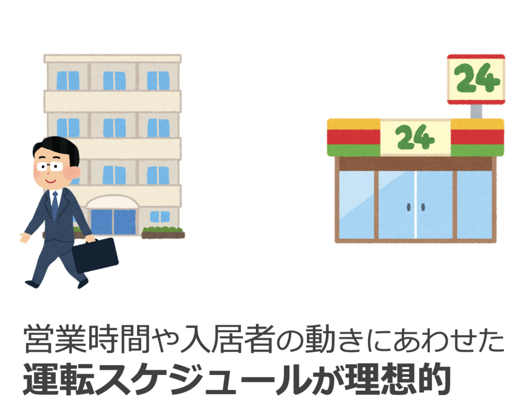 そして当然のことながら、夜間は人の利用も減ります。店舗なら営業時間外となりますし、アパートやマンションであれば深夜の出入りは昼間よりも少なくなるでしょう。なので夜間運転の休止は燃料消費や利用密度の観点から合理的な判断ということになります。一方で24時間営業の店舗や、たとえば病院などの近くで夜勤者の多い物件など、夜間運転が必要なケースもありそうです。