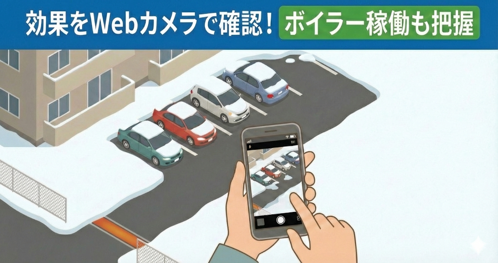 せっかく設定変更をしても、期待した省エネが得られているか、または運転が抑制されすぎていないか知る必要があります。実際の省エネ効果は料金請求を見ないと分かりませんが、融雪状況についてはWebカメラなどを設置すると本当によく分かります。また、とけピタ君を導入するとプランにかかわらずボイラーのON/OFF状態も同時に把握することができます。