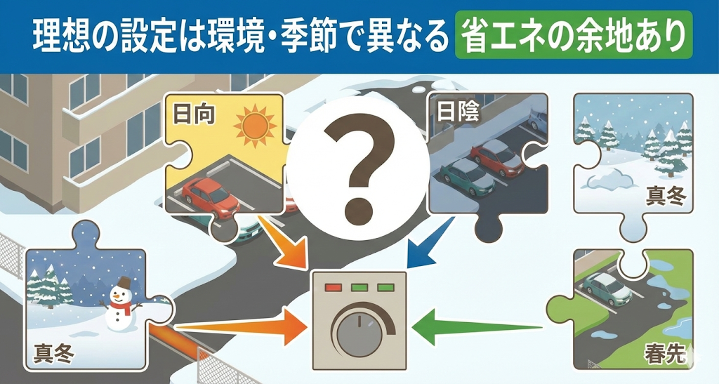 じつは状況によって大きく異なります。日当たりはどうか、地域はどうか、真冬なのか春先なのか。いろいろな条件を考慮に入れる必要があります。また、ボイラーの出力や台数、敷設面積、制御盤とボイラーの相性などの装置側の要因もあるので、全ての物件にあてはまる設定というのはありません。では外気温の初期設定はどのように決められているのでしょうか。これはメーカー側の配慮として「多くの物件が融雪不足にならない」ように設定されていると捉えるとわかりやすいかもしれません。つまり設定による省エネの余地のある物件は相当数あると考えていいと思います。